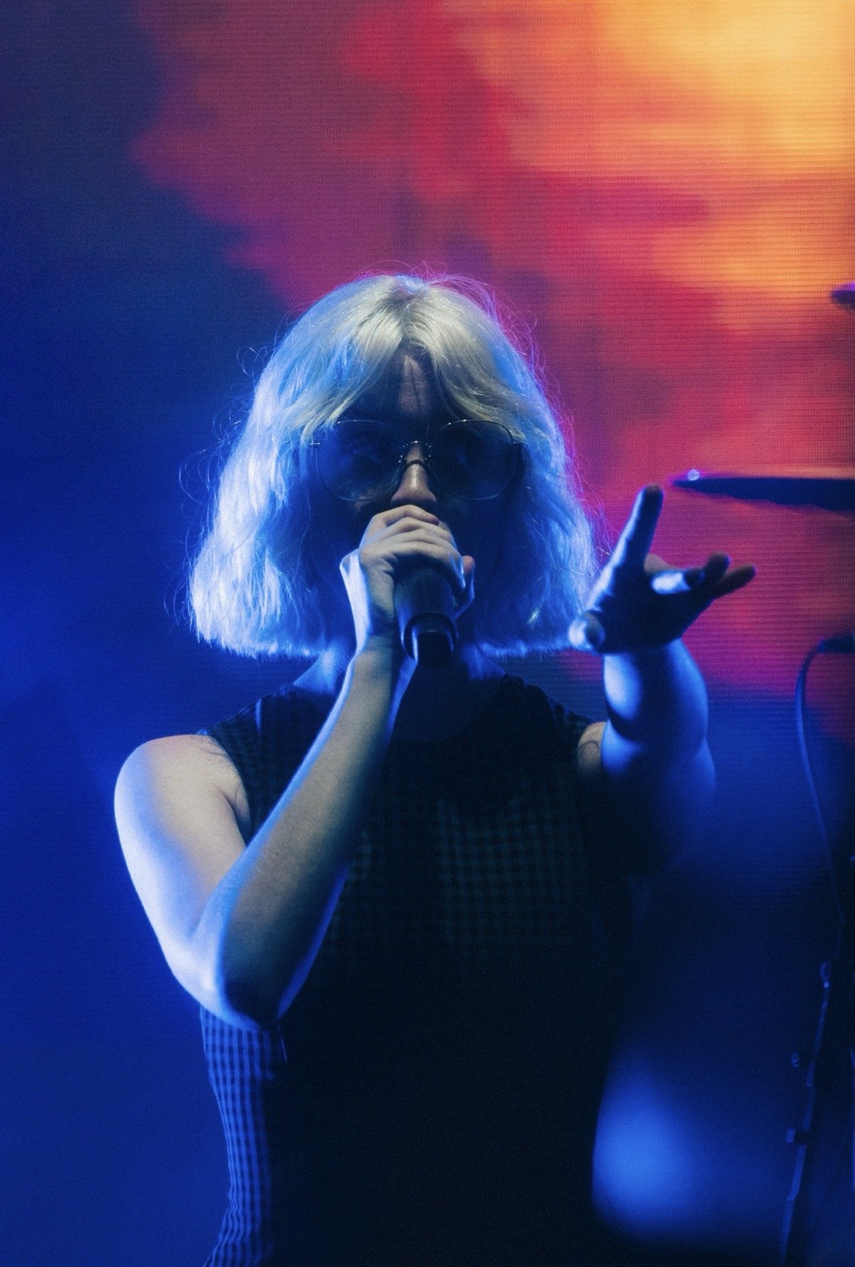 A woman with blonde hair and sunglasses singing into a microphone on stage with colorful lighting in the background.