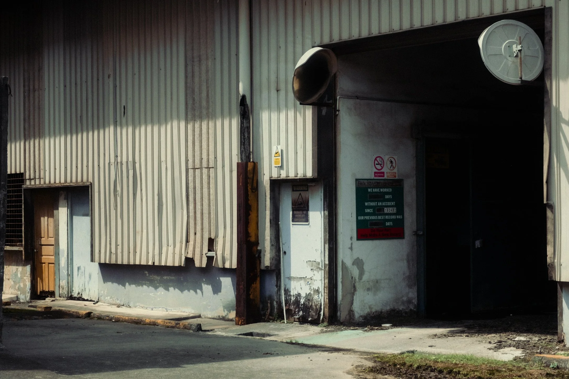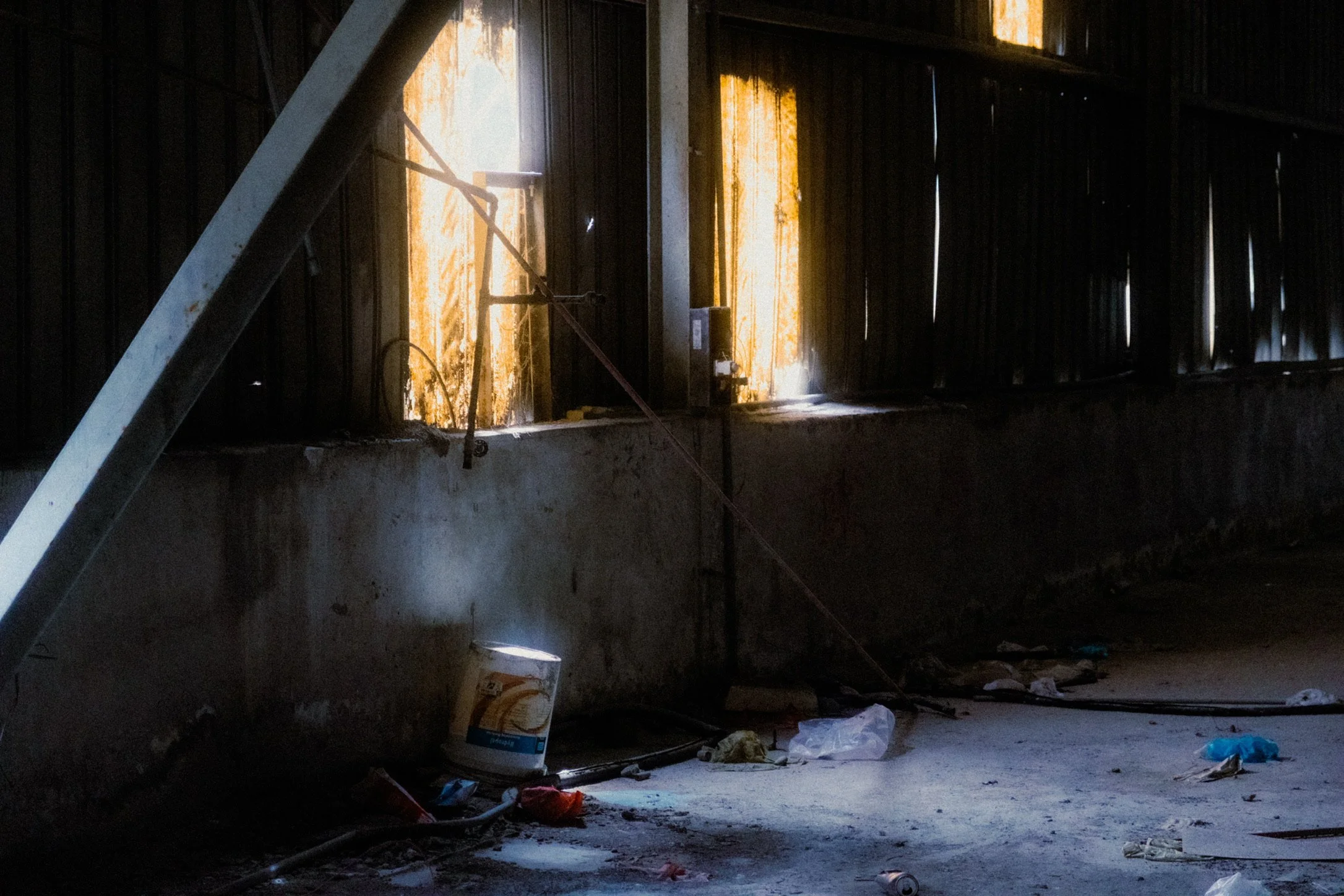 Two people, one standing on the left side and one entering a closed shopping area or market through escalator, inside a dimly lit indoor space.