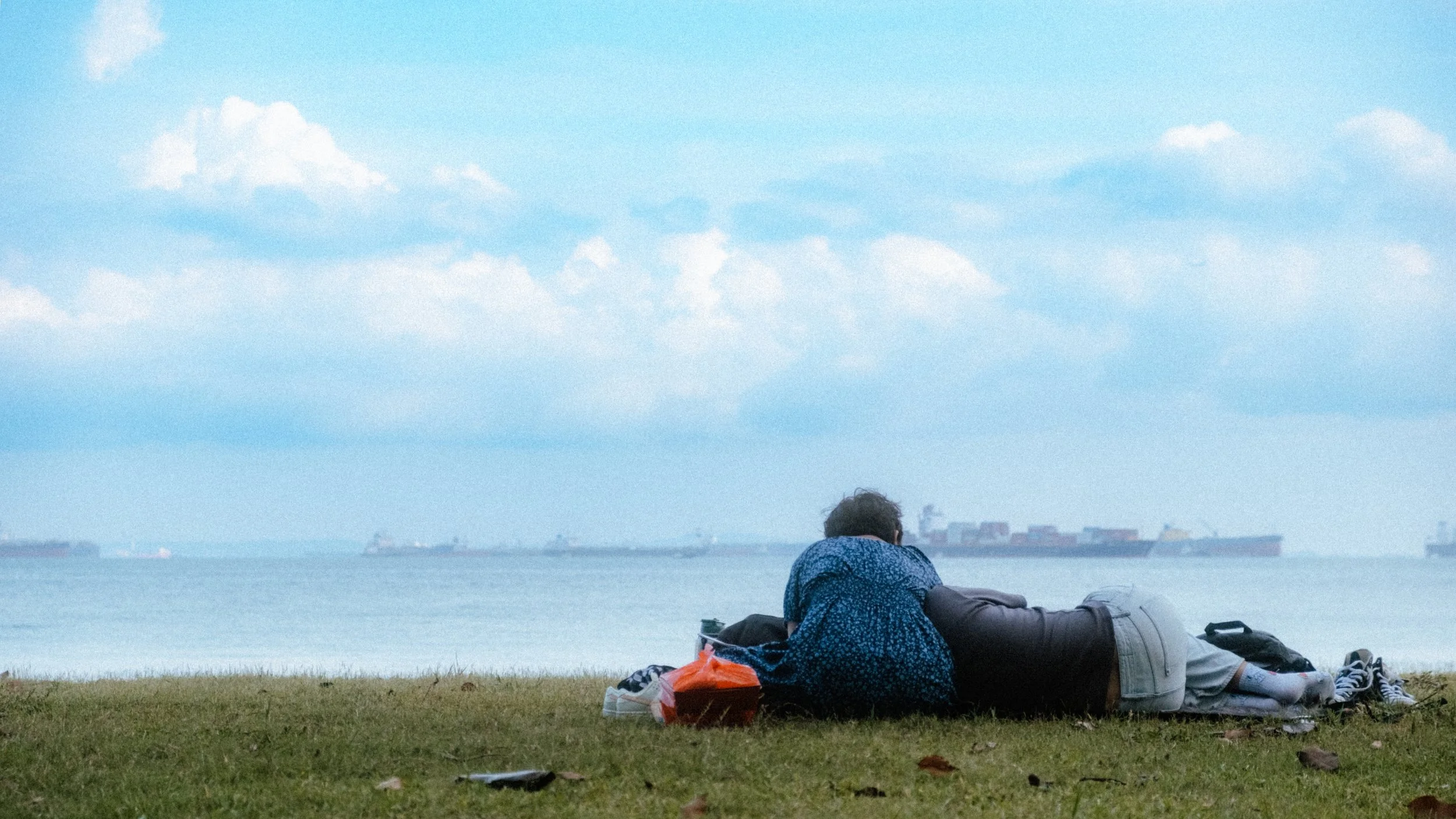 A couple lying on the grass near the water, with ships visible in the distance and a cloudy sky above.
